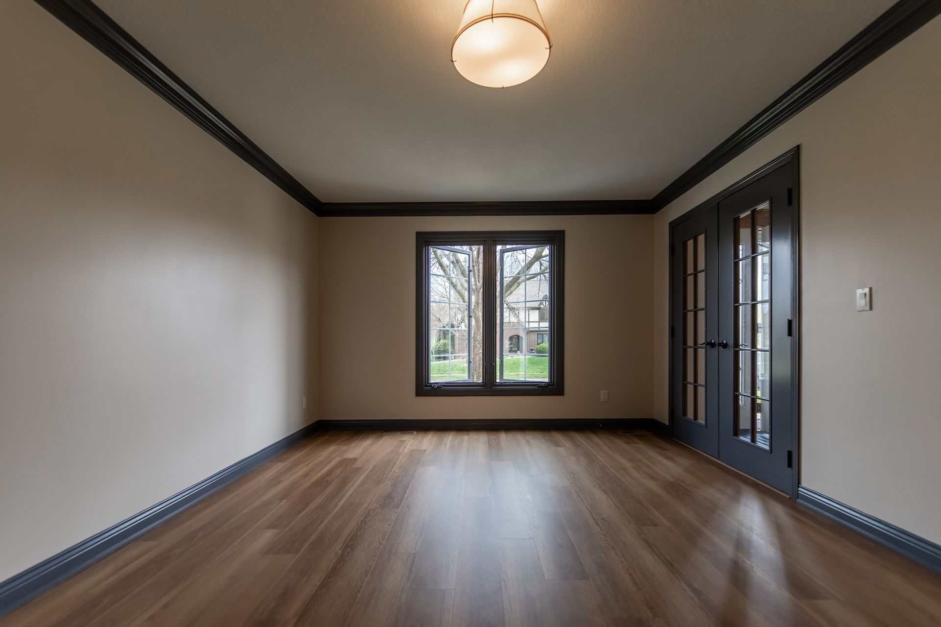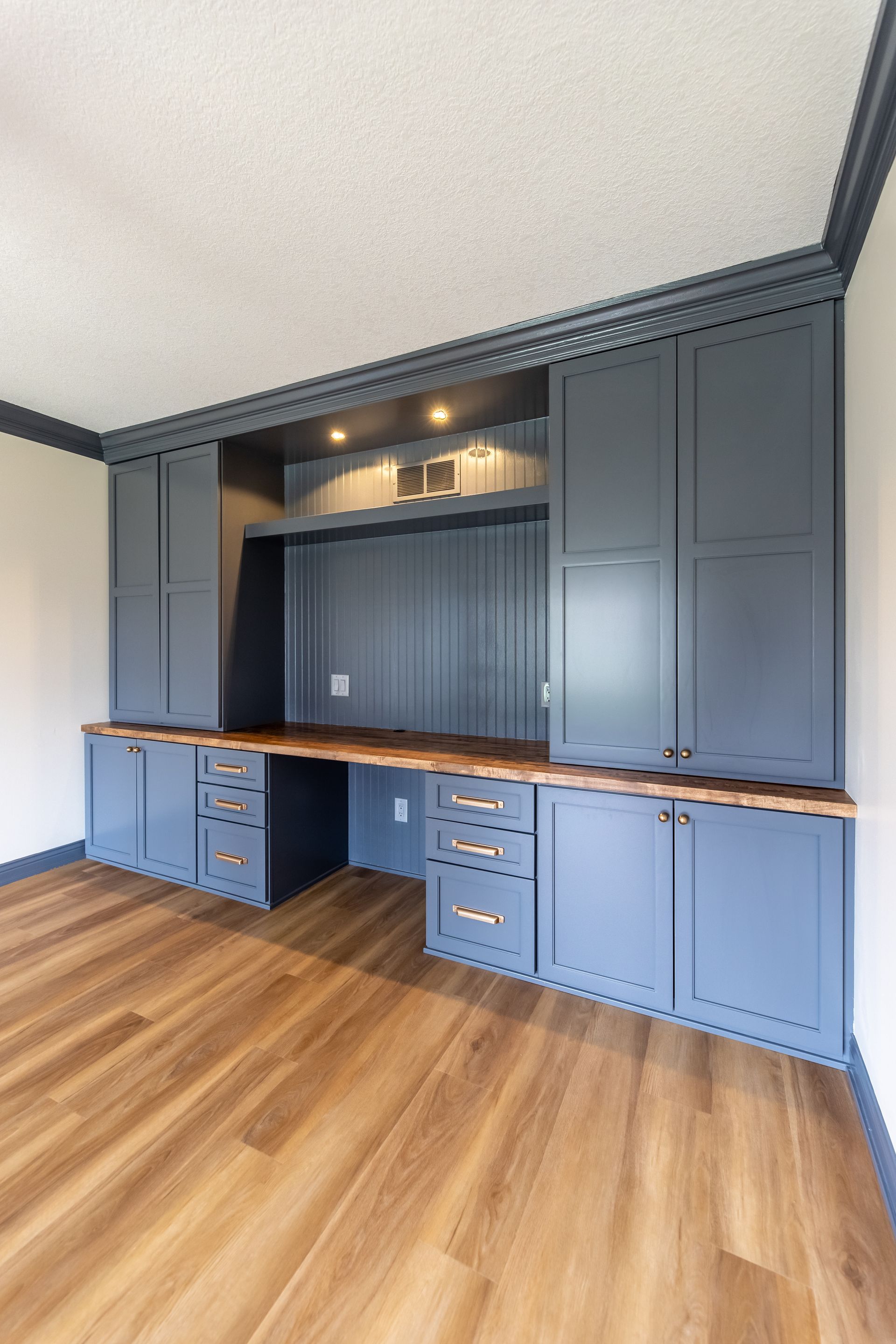 The front room of this client's home in Urbandale went from basic to ready-to-work! We installed a wall of cabinetry with a hardwood desktop, with new flooring and paint for the entire room. The client eventually finished this space with large center desk to make it even more functional for the whole family.