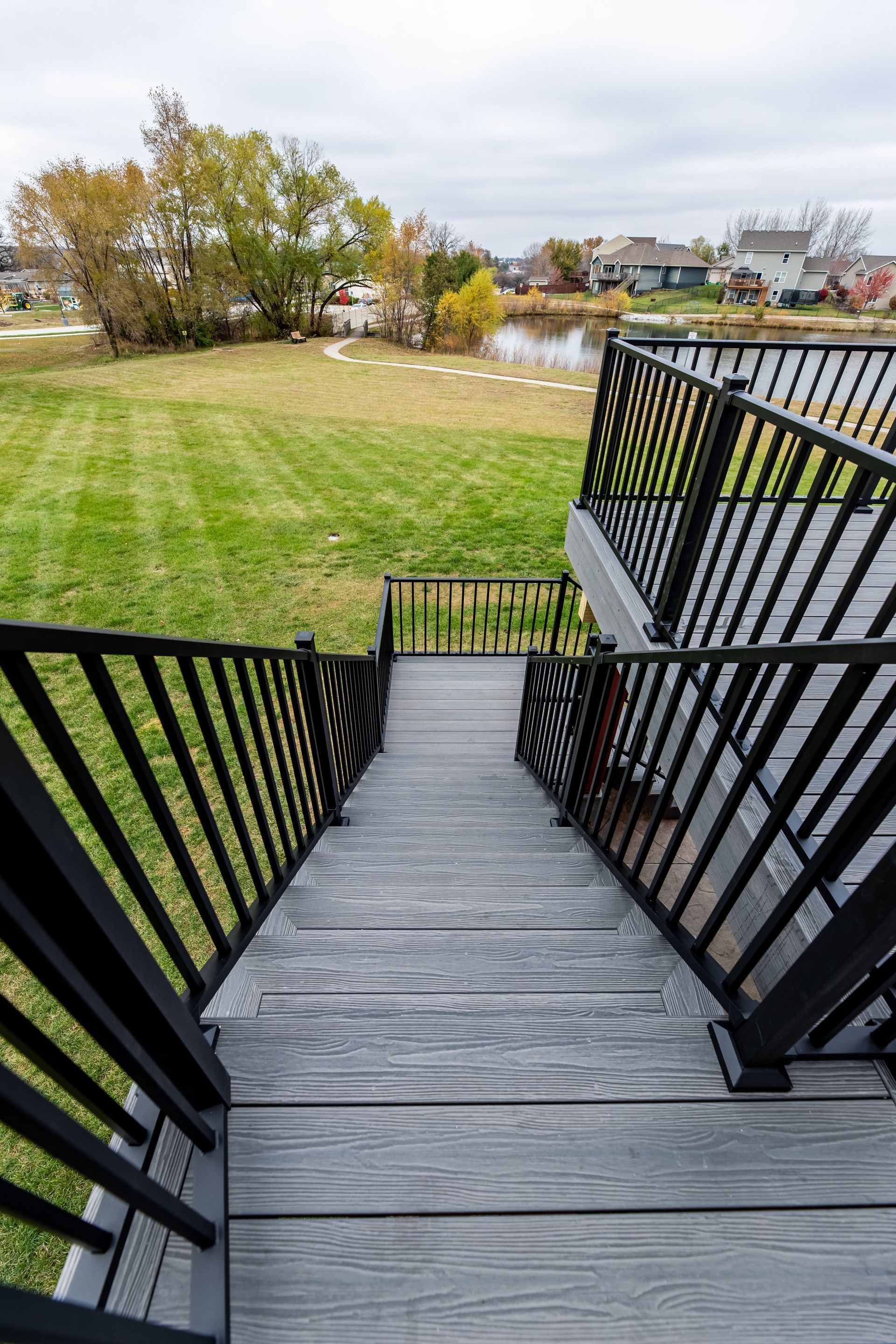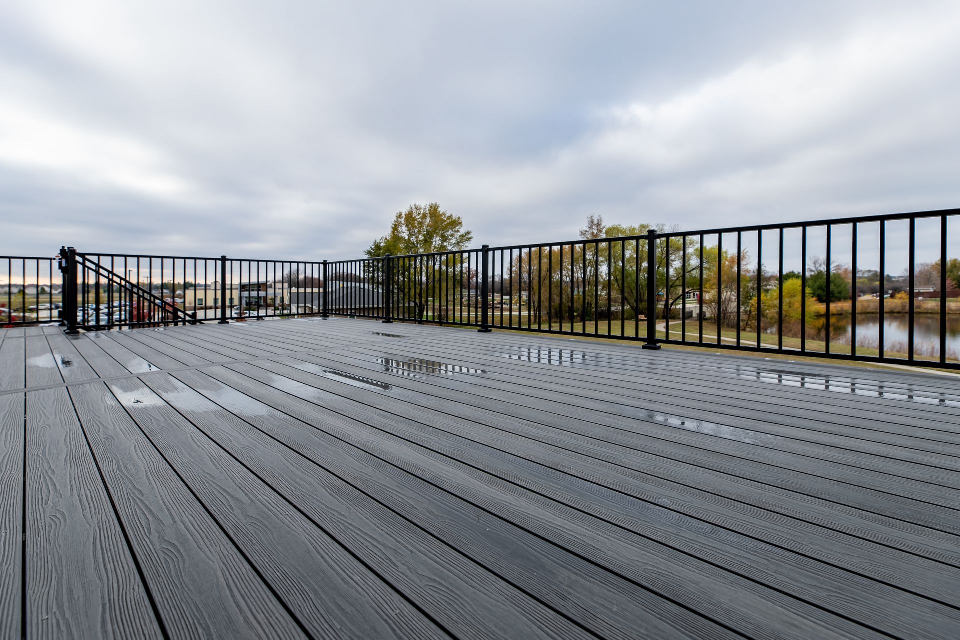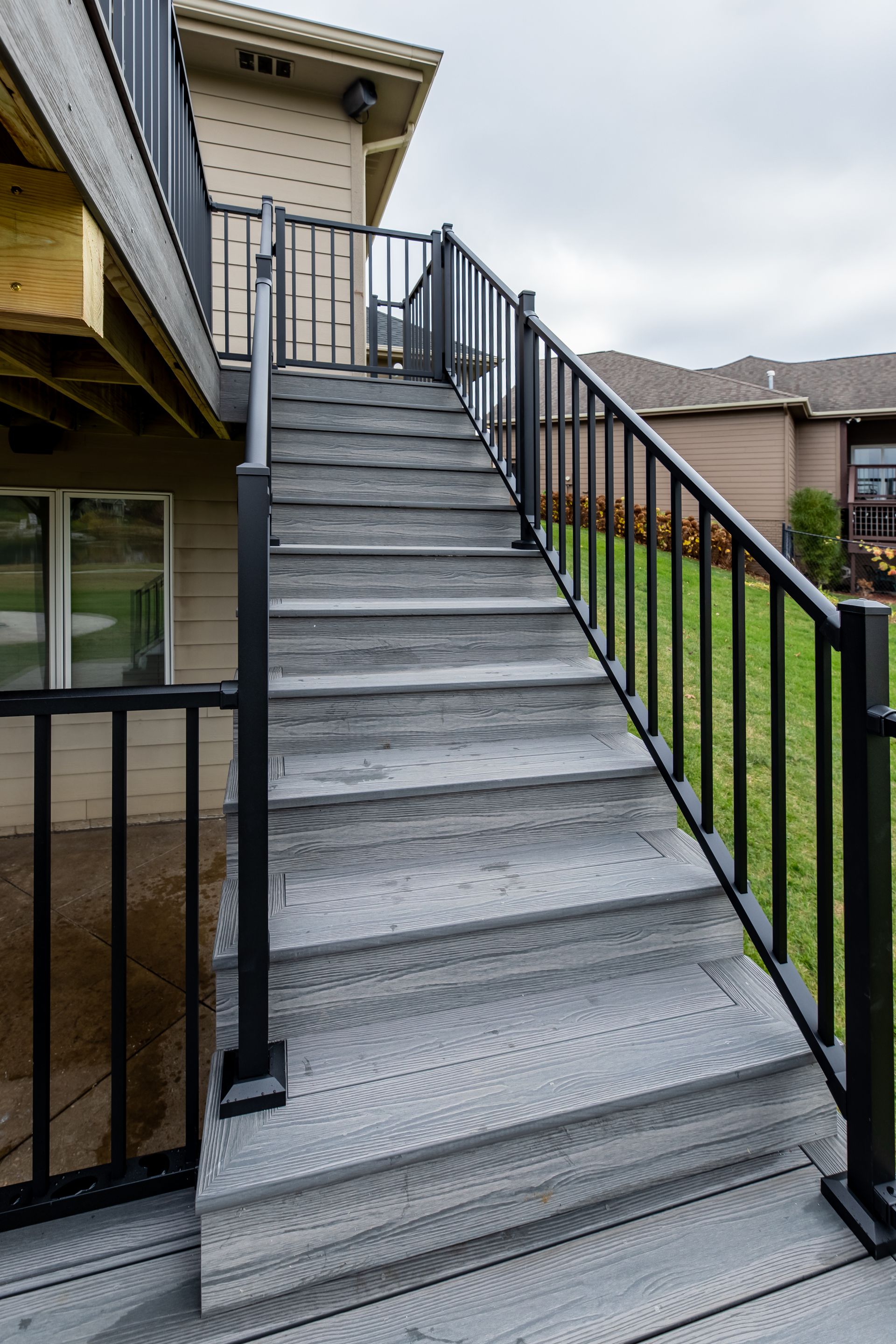This project was a large PVC composite deck in Ankeny. The client chose a gray PVC decking with a black aluminum handrail. These products will last many decades with little-to-no maintenance!