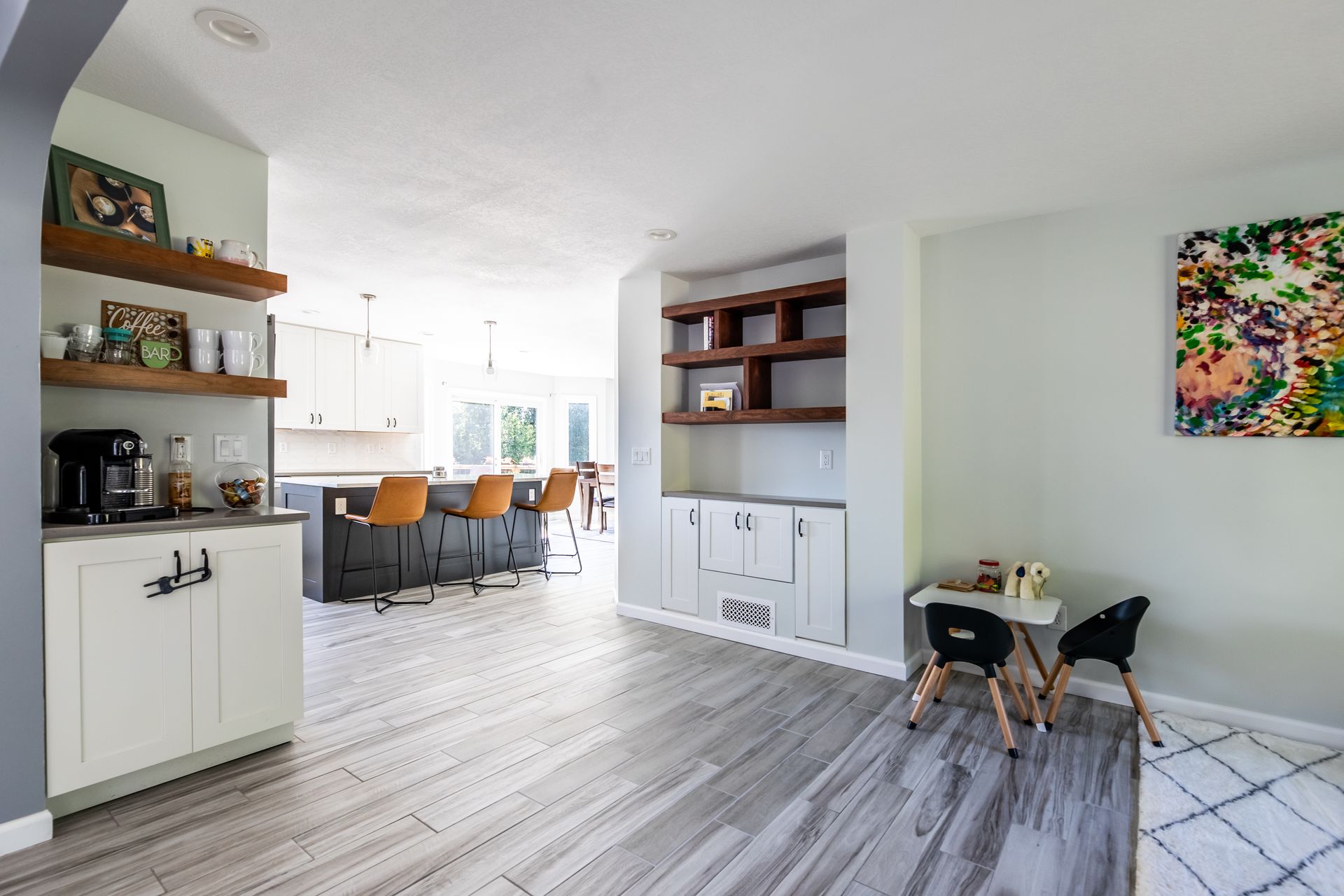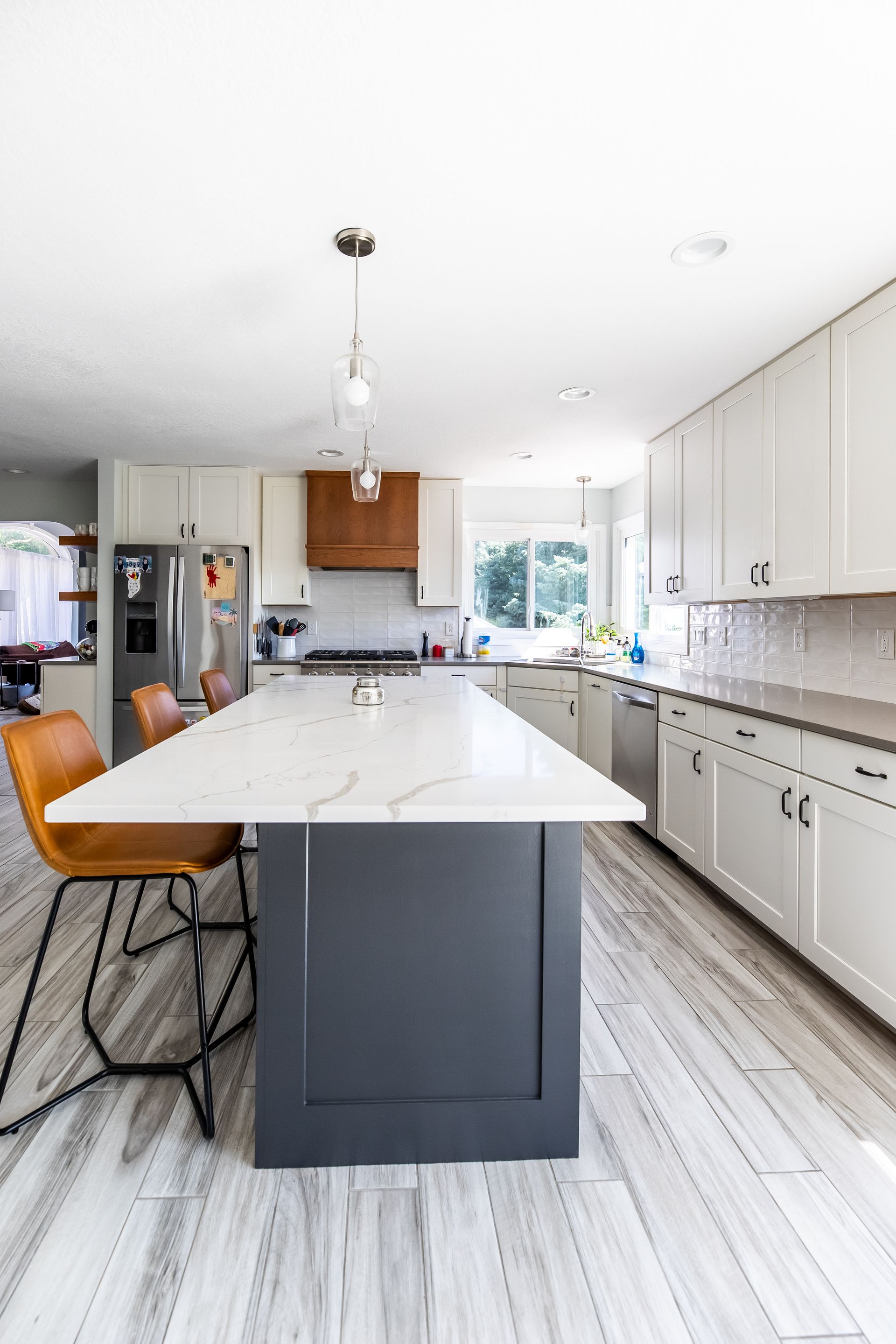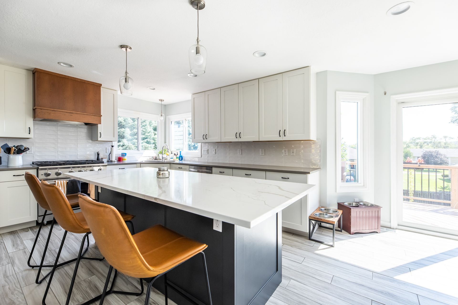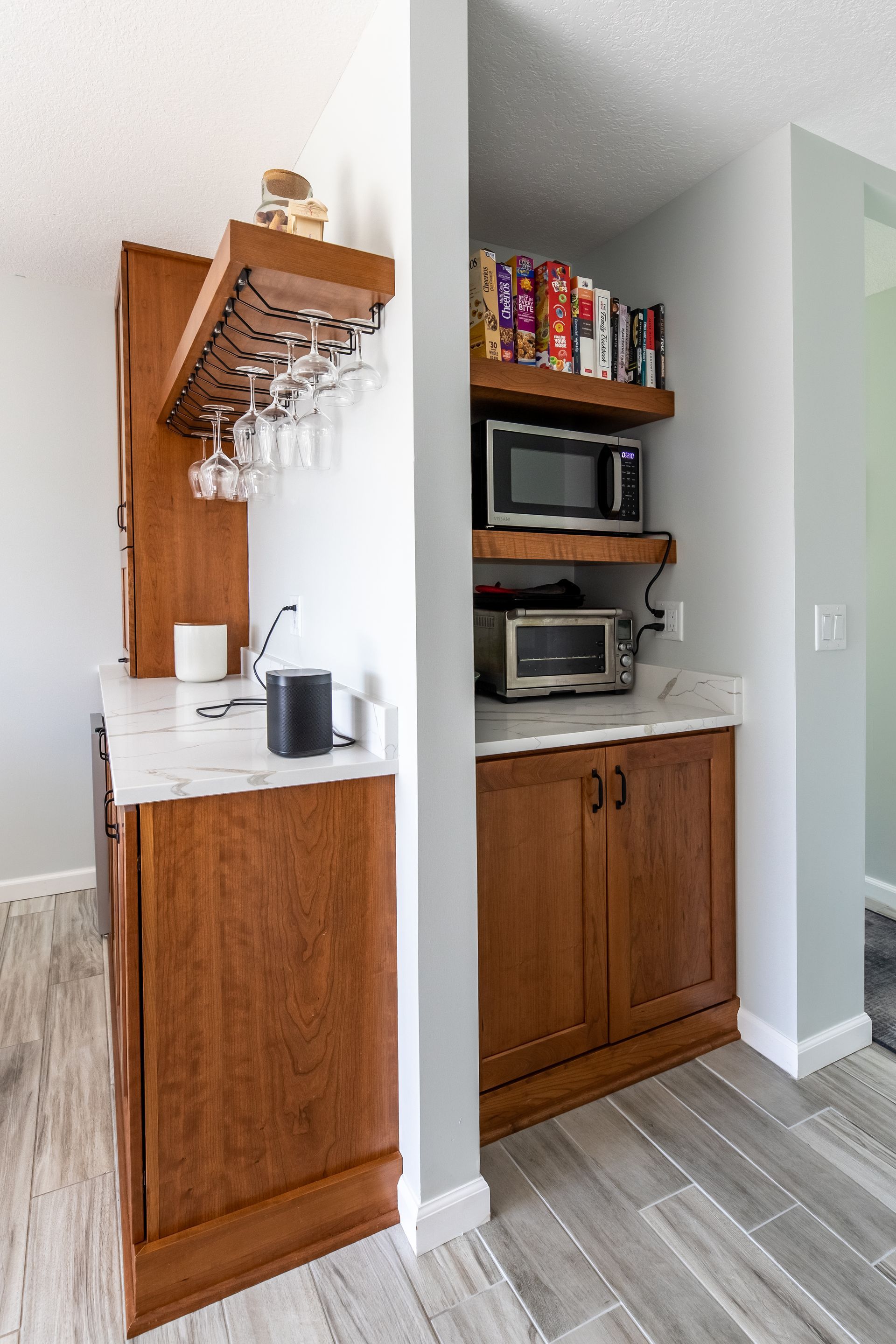 This kitchen remodel in West Des Moines included removing a pantry room in the middle of the space to open up the floor plan, installing new cherry cabinets in certain areas, as well as many other custom features.